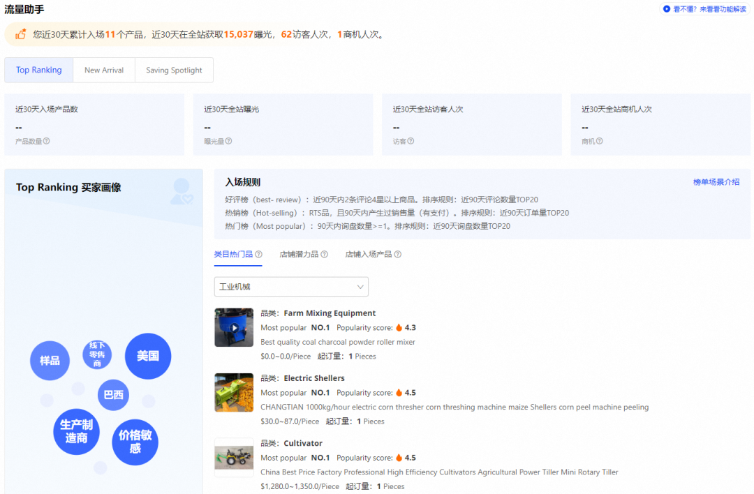国际站新规——流量助手-Saving Spotlight(惠采购)场景上线流量助手-Saving Spotlight(惠采购)场景上线 2023年06月28日全量上线 国际站服务中CGS且为数据参谋用户商家(逐步开放,以系统显示为准) 数据参谋-流量参谋-流量助手 为了方便商家了解前台导购场景的入场规则,以及已入场商品的流量效果情况,帮助商家更快满足规则获取前台导购场景流量,数据参谋-流量参谋已将上线“流量助手”,解锁了Top ranking 和New arrival场景规则,本次上线Saving spotlights场景,具体内容如下。 主要内容 ![]() 本次新上线的有Saving spotlights场景(惠采购场景)。 场景包含 场景包含:场景效果、买家画像、入场规则、热卖榜、店铺潜力品、店铺入场产品六个模块,各模块功能介绍如下: