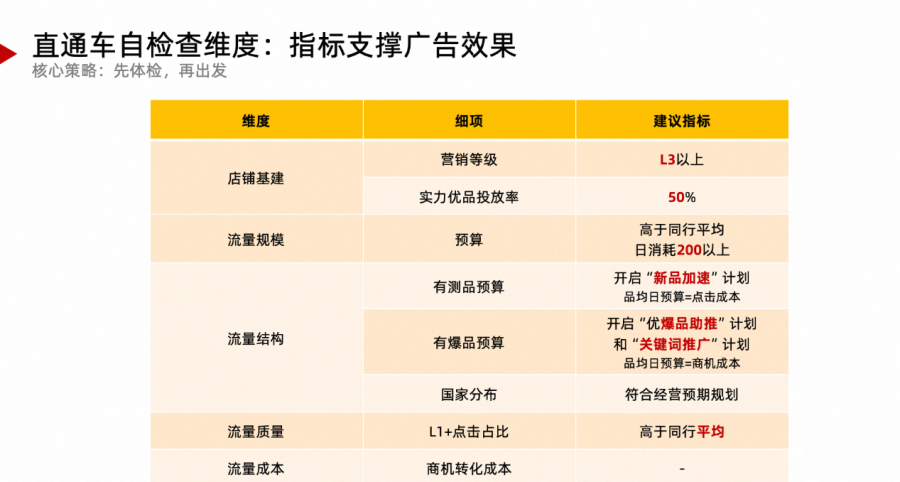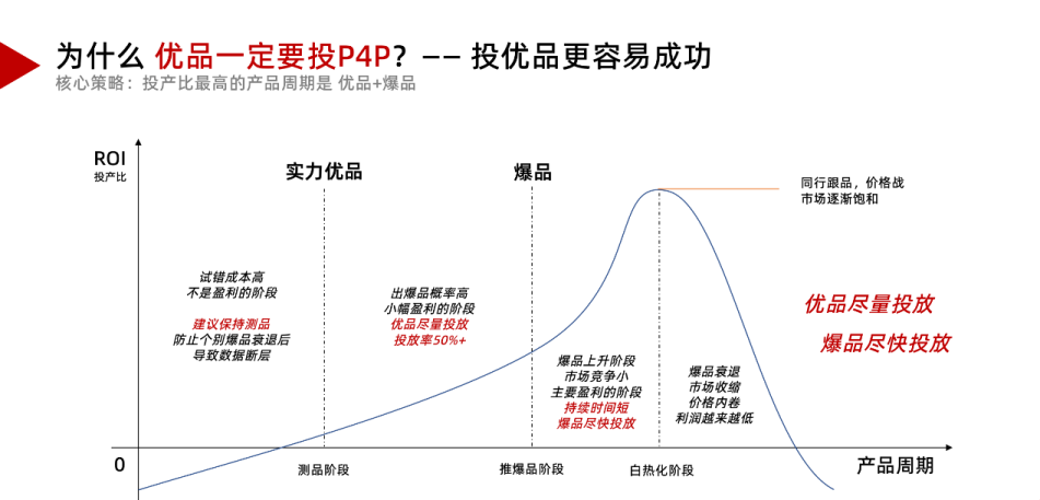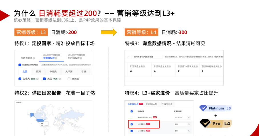直通车手动投放SOP尽可能提高优品投放直通车的比例,投放直通车根据情况赠送自然流量 围绕目标市场做精细化投放,不同产品投放不同国家 营销等级至少达到L3(日消耗200元以上) 更关注优质商机成本,而不是点击成本,可以多使用控成本计划 ![]() ——投优品更容易成功 核心策略:投产比最高的产品周期是优品+爆品 ![]() ——营销等级达到L3+ 核心策略:营销等级达到L3+,是P4P效果的基本保障 ![]() 筛选优品、打爆品,同时赚自然流量,流量最大化 给顶展/问鼎/直播间提供绑品参考,提高点击率/转 化率