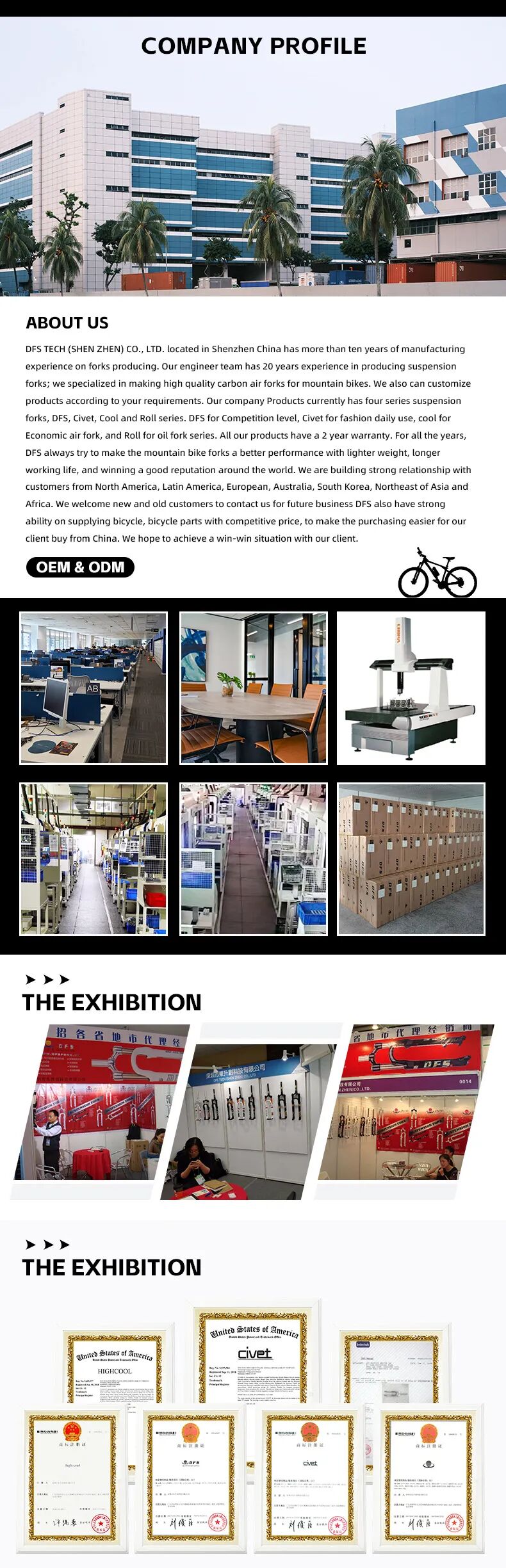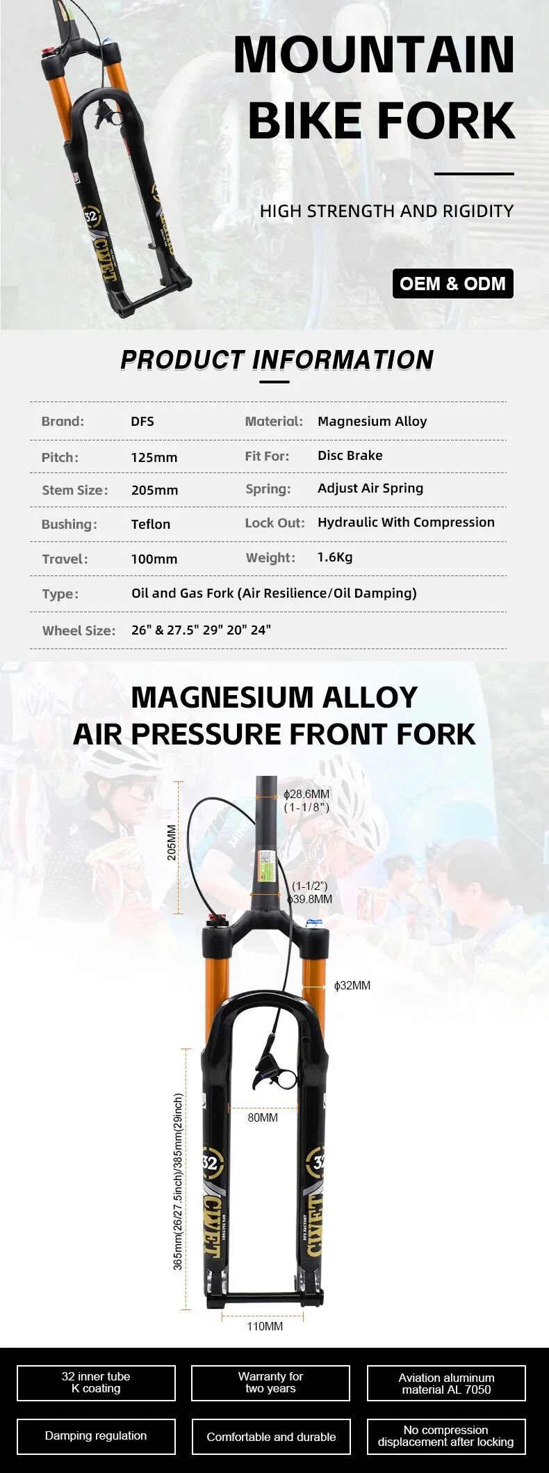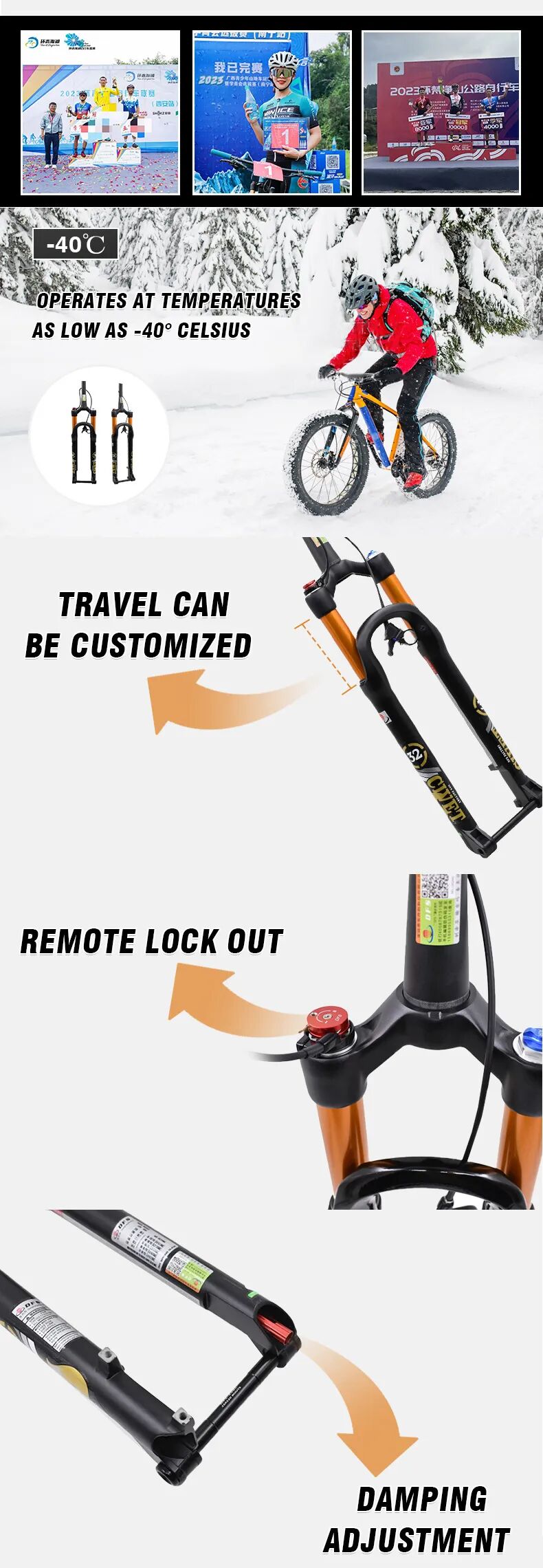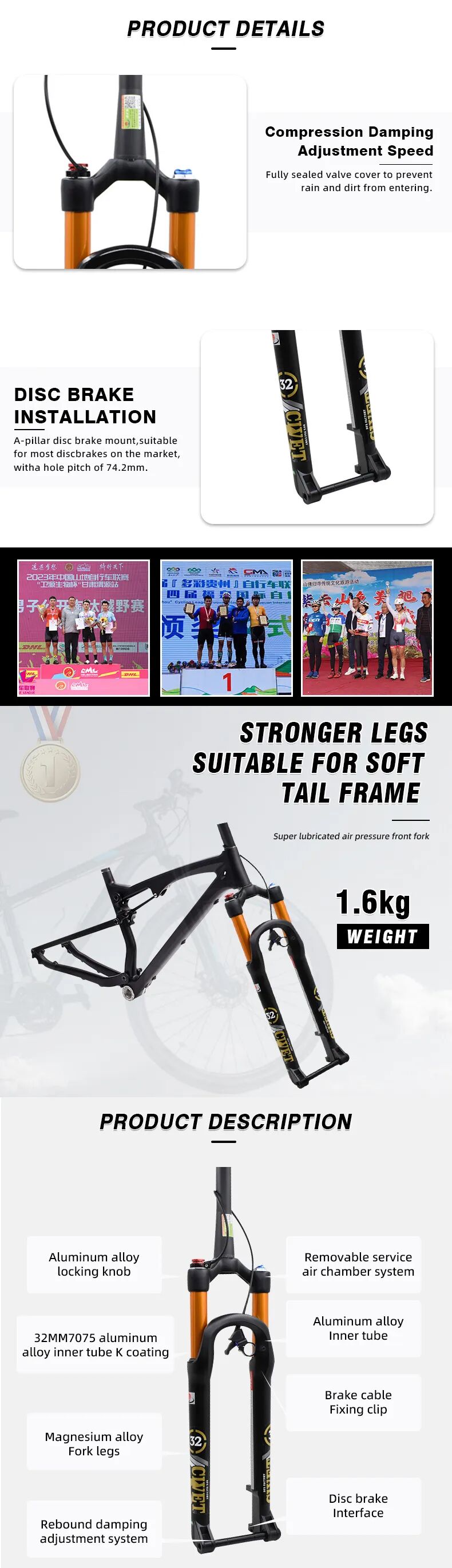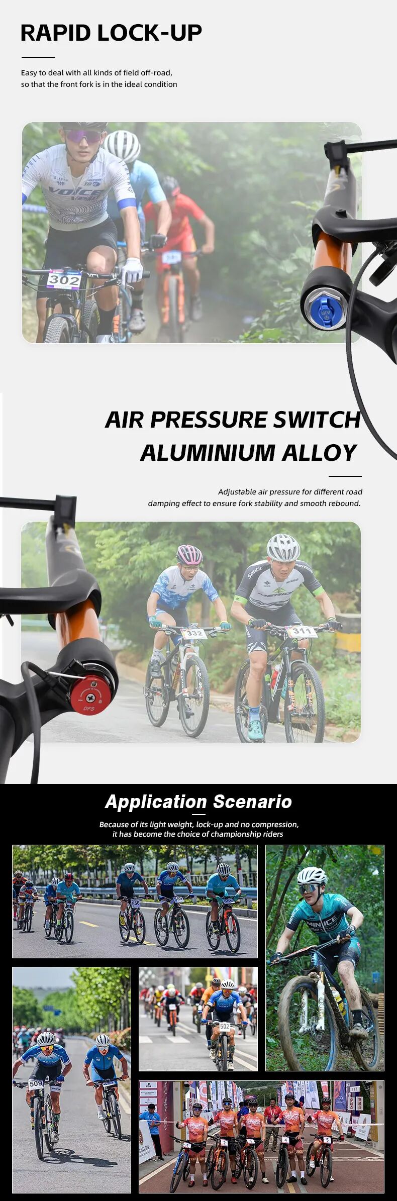 该自行车前叉产品的详情页设计主要为突出产品高性能、轻量化为主,同时通过应用场景展示产品的外观设计,让客户直观了解到产品的高端品质以及产品优势。